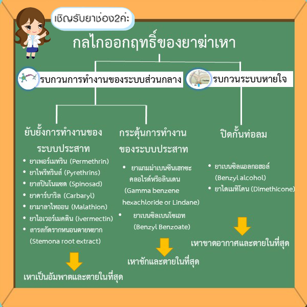 กลไกการออกฤทธิ์ของยาฆ่าเหาจะแบ่งเป็นสองกลไกหลัก คือ